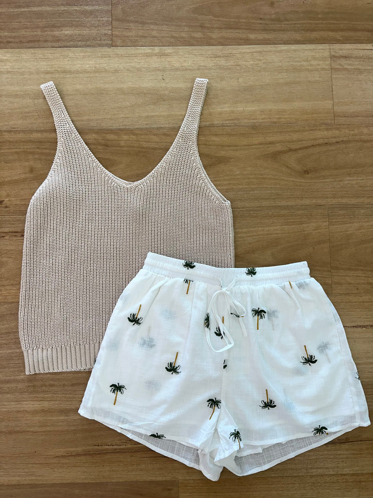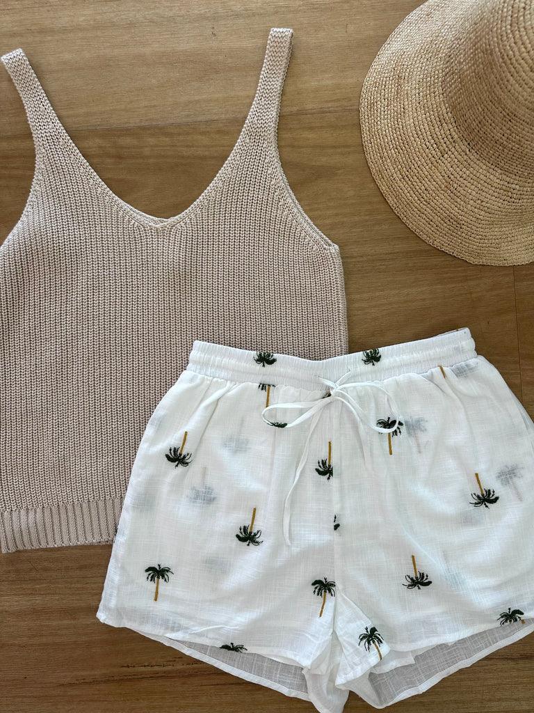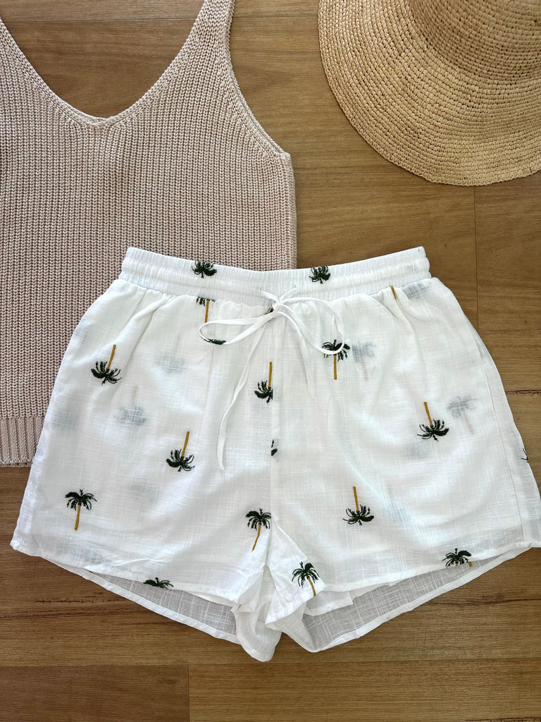 - Colourway: White with embroided palm trees